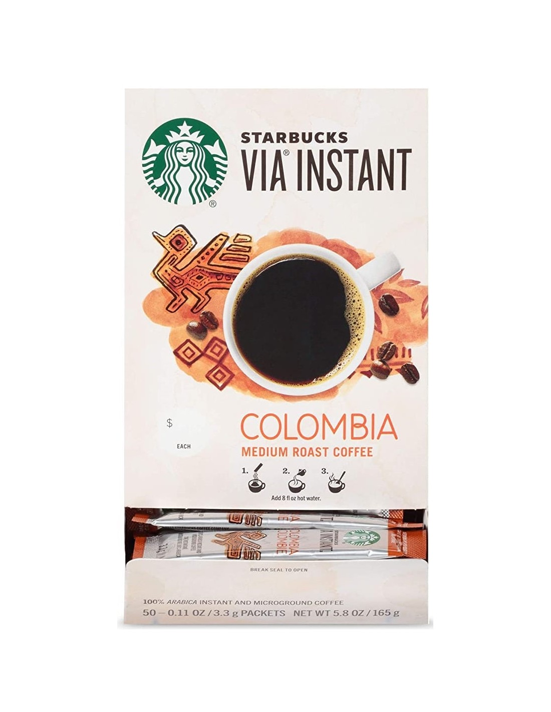 قهوه فوری استارباکس مدل کلمبیا از دانه ی کشت شده در مزارع رشته کوه های آند به دست آمده و از محصولات پر طرفدار کمپانی استارباکس می باشد. قهوه یک نوشیدنی محبوب در بسیاری از نقاط جهان است که کاملا سالم و کم کالری میباشد. قهوه فوری گزینه ای سریع و آسان برای دست یابی به یک فنجان قهوه است و ضرورتی برای استفاده از قهوه ساز برای آن وجود ندارد. کافئین موجود در قهوه فوری عملکرد مغز را بهبود میبخشد و همچنین در کاهش خطر ابتلا به دیابت نوع 2 موثر میباشد و ممکن است سوخت و ساز را افزایش داده و به چربی سوزی بیشتر کمک کند.