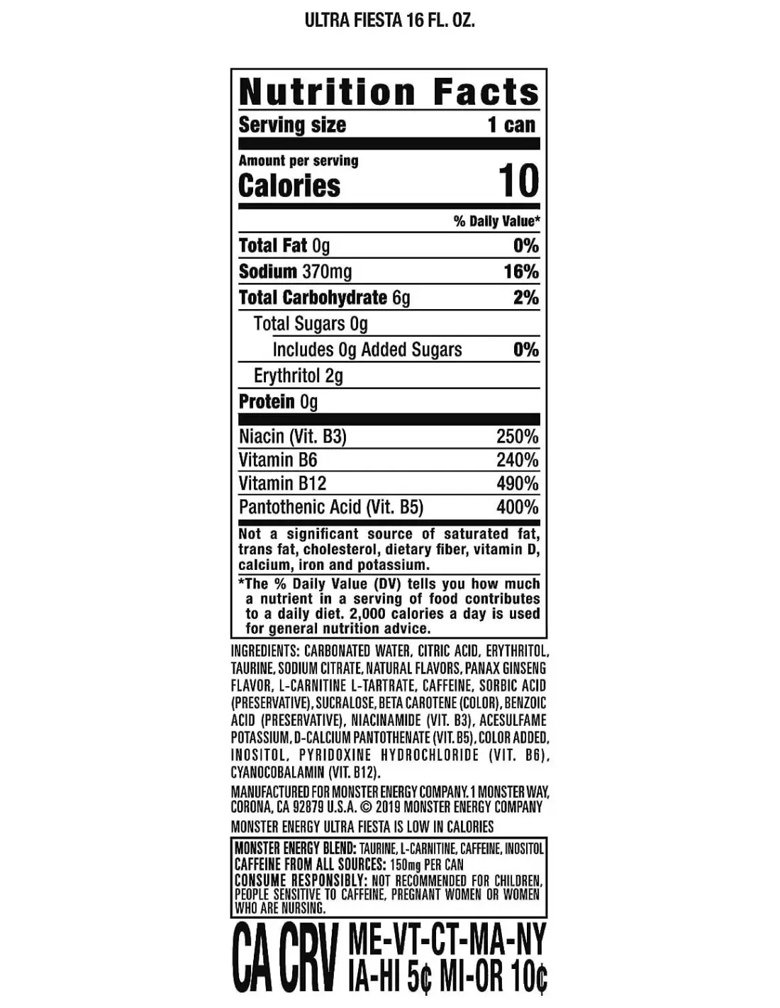 هر دو نسخه معمولی و کم کالری نوشیدنی انرژی زای مانستر منبع خوبی از چهار ویتامین از هشت ویتامین B هستند. یک وعده 100 درصد ارزش روزانه ویتامین B-12، ریبوفلاوین، نیاسین و ویتامین B-6 را تامین می کند.